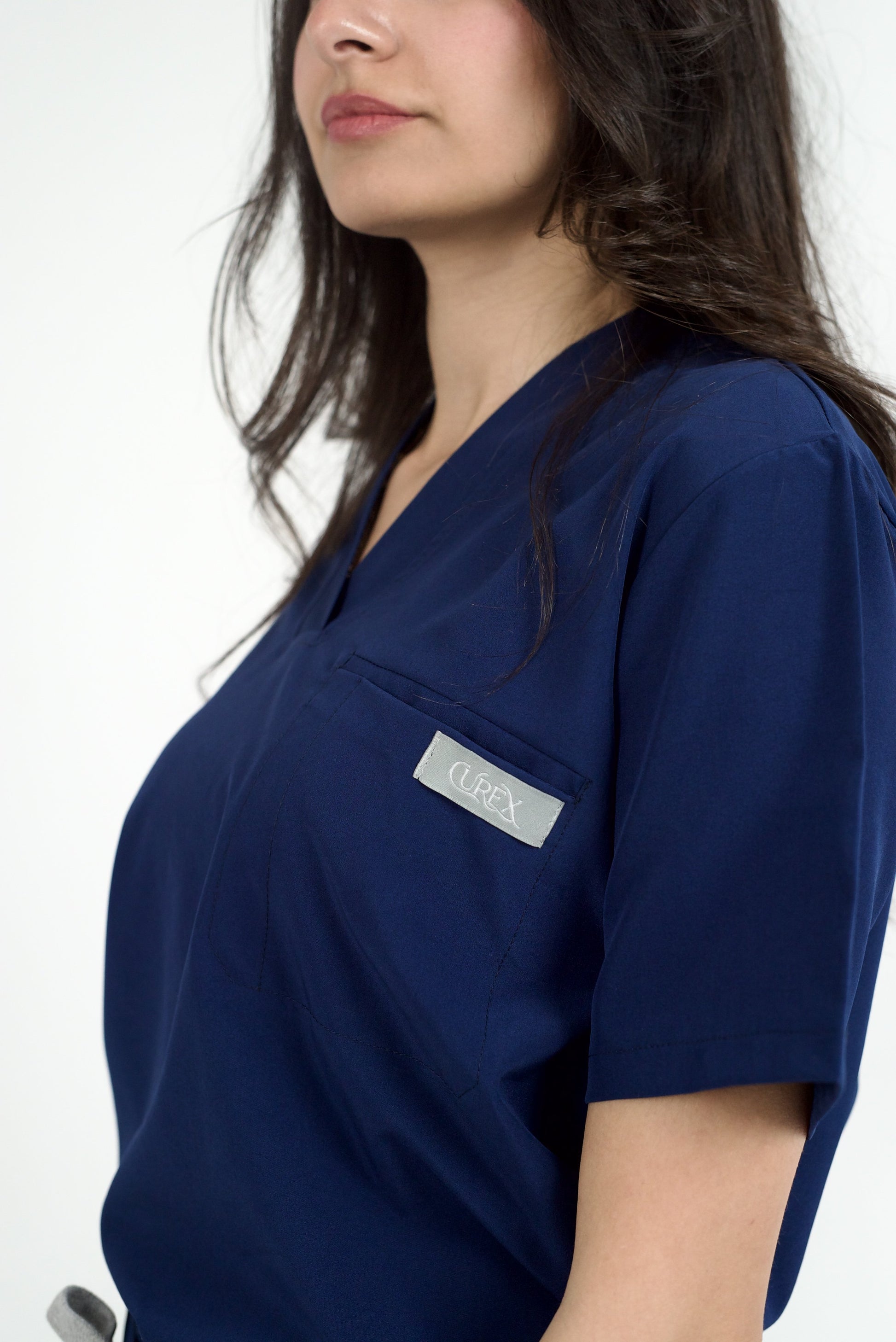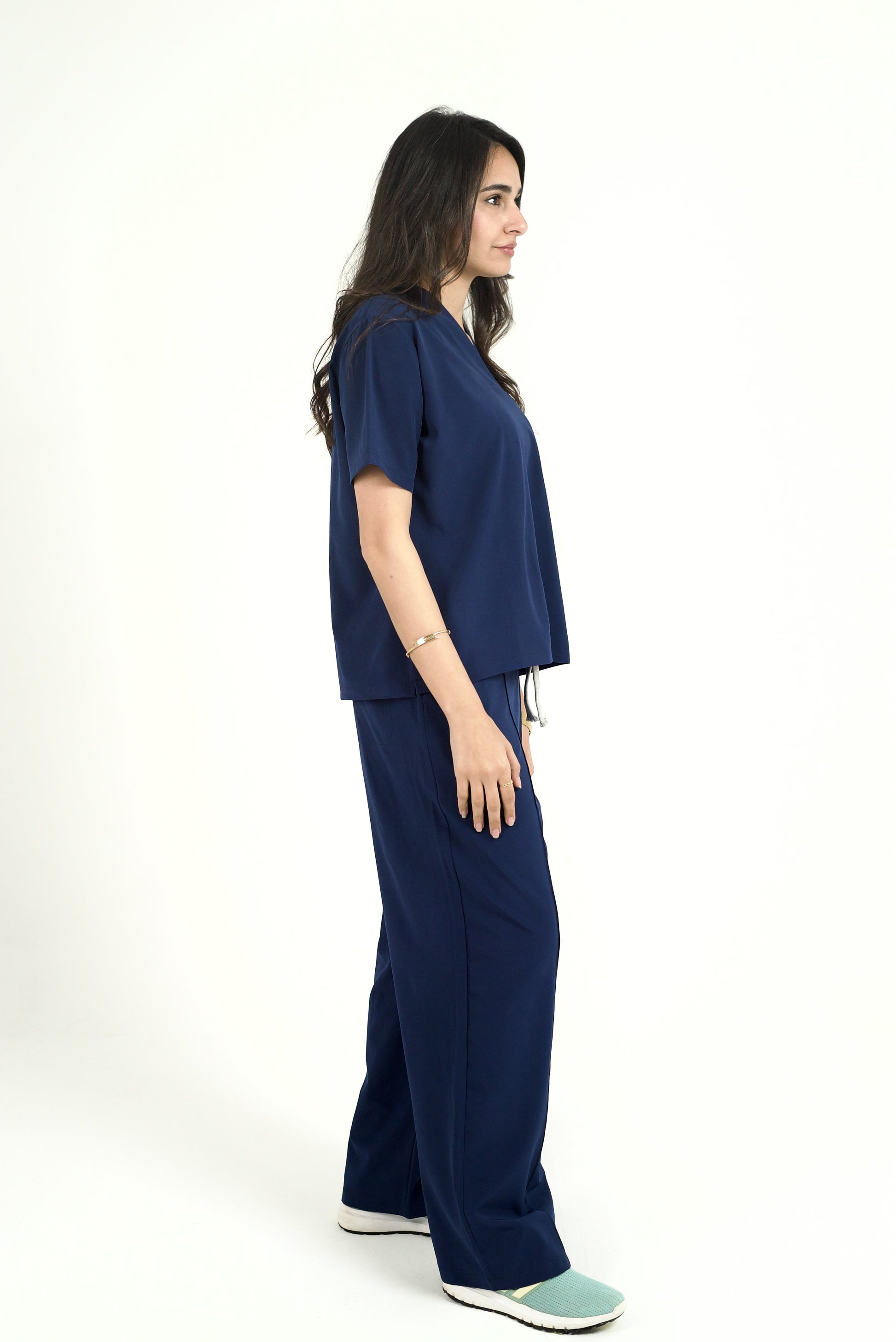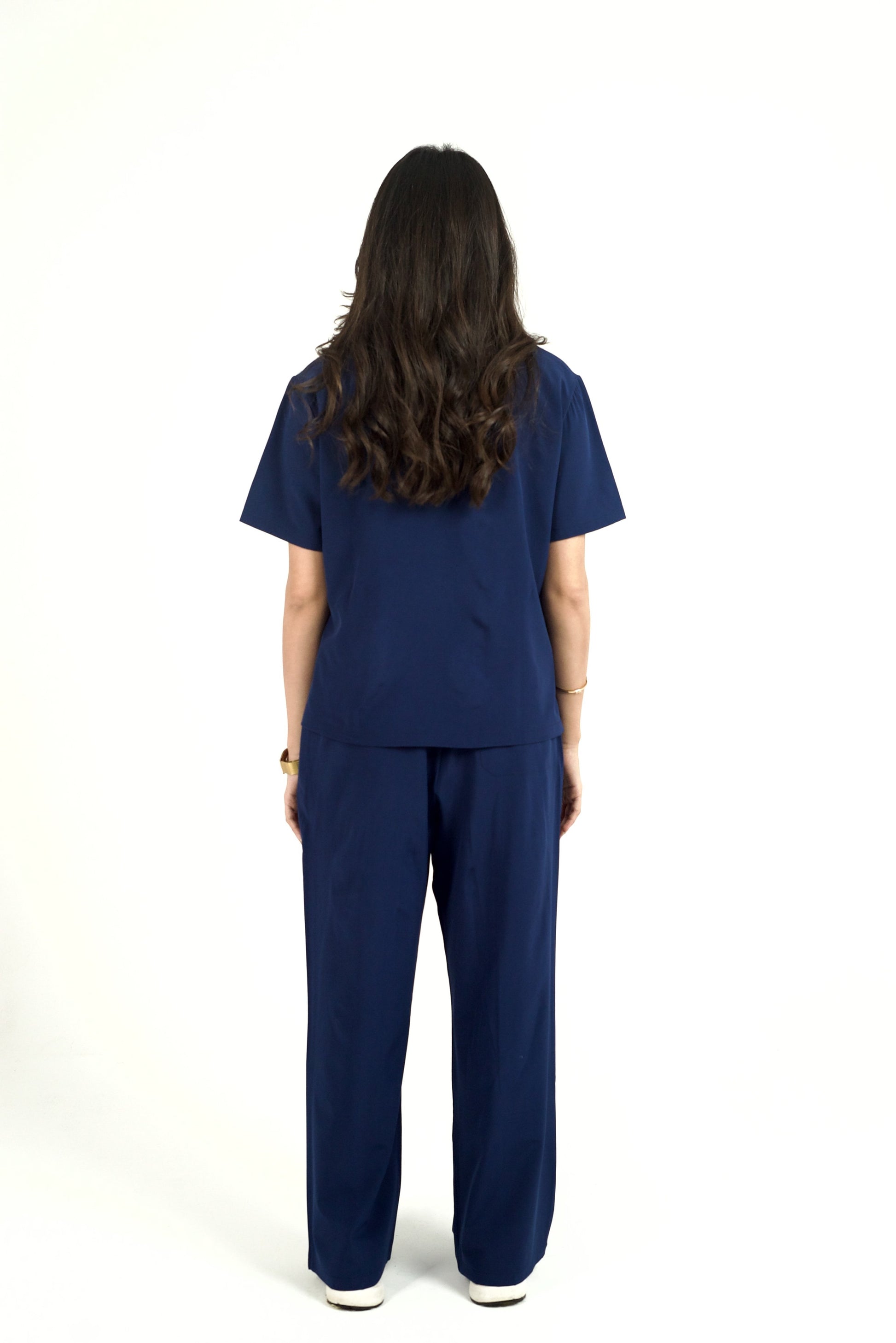 Stay effortlessly stylish and comfortable with the Midnight Care Scrub Set. Made from ultra-soft, moisture-wicking fabric, this set is perfect for long shifts. The tailored top features a zippered neckline for a modern touch, while the pants are designed with an elastic waistband and multiple storage pockets. The deep navy blue color adds a sophisticated and professional edge to your medical wardrobe.