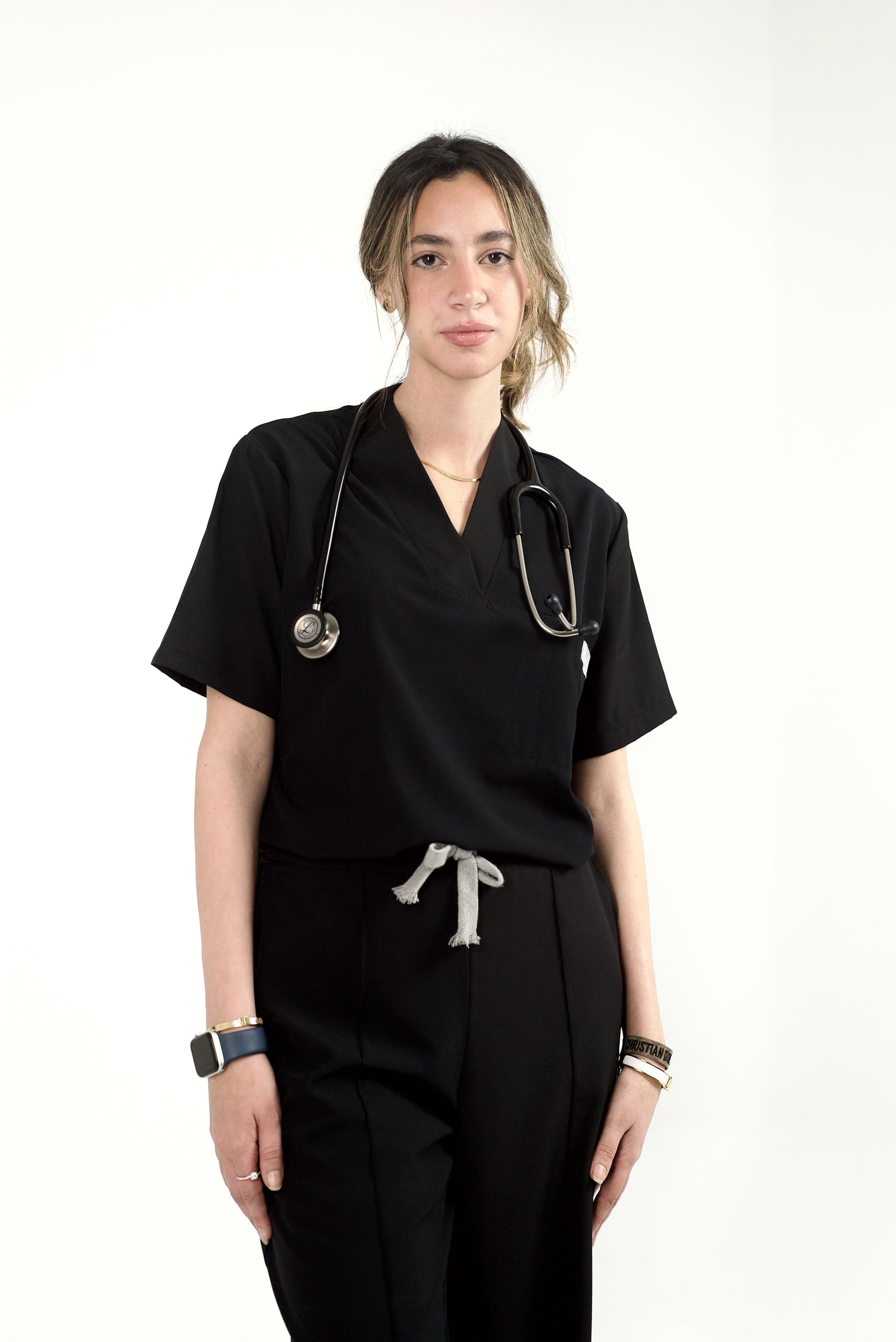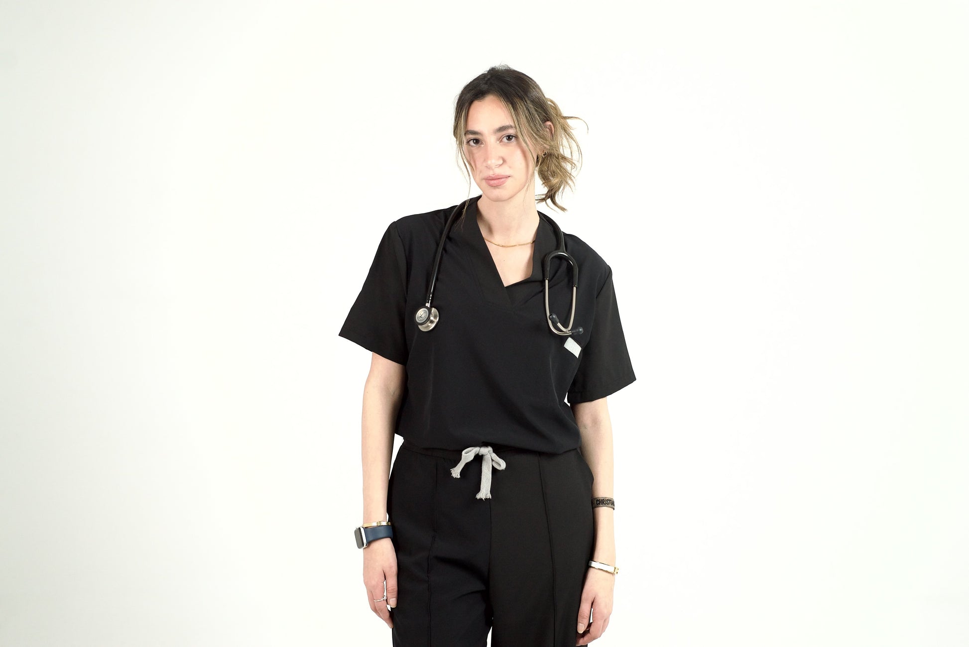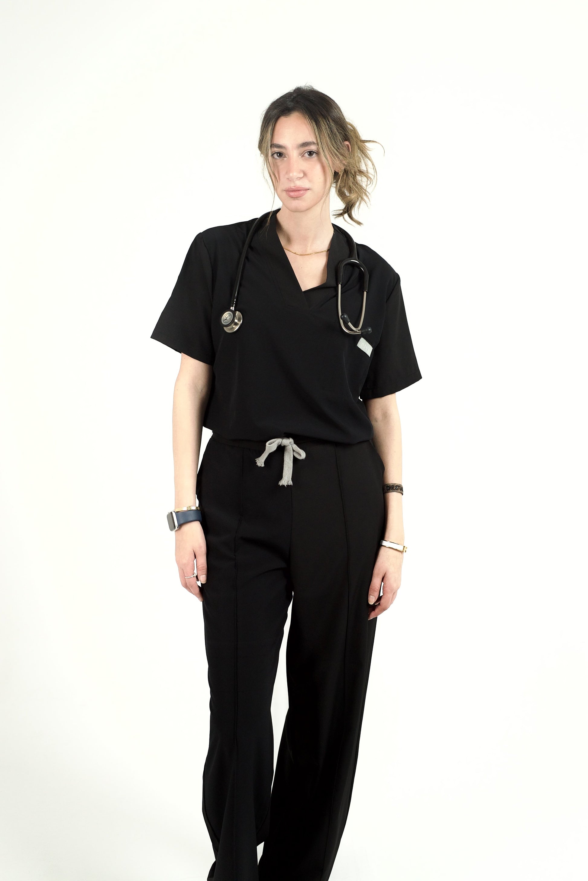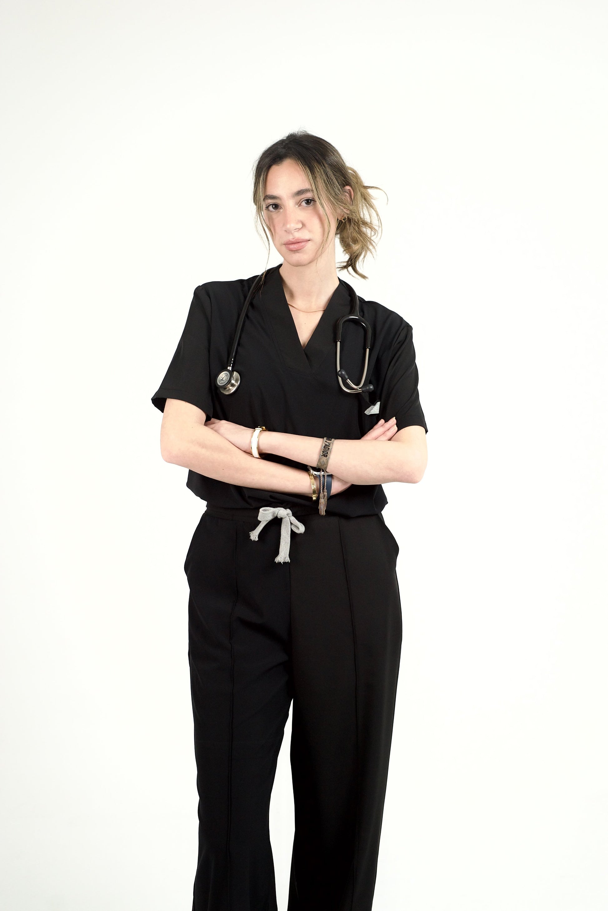 The Shadow Flex Scrub Set is where comfort meets elegance. Designed with a figure-flattering silhouette and four-way stretch fabric, this set allows you to move freely while maintaining a polished look. The top features a minimalist design with functional pockets, while the tapered pants provide a modern, professional fit. Whether in the ER or a clinic, this scrub set keeps up with your demanding schedule.